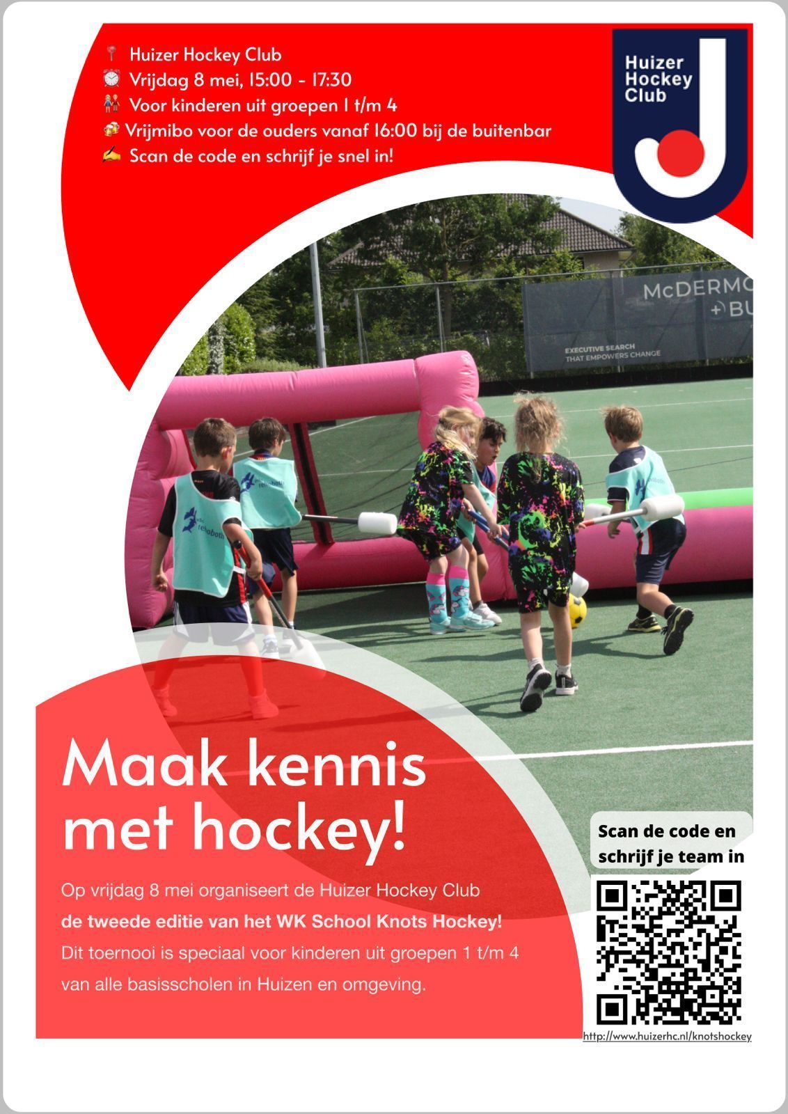 Op vrijdag 8 mei 2026 organiseert de Huizer Hockey Club voor de tweede keer het School Knotshockey Toernooi voor basisscholen in Huizen en omgeving.